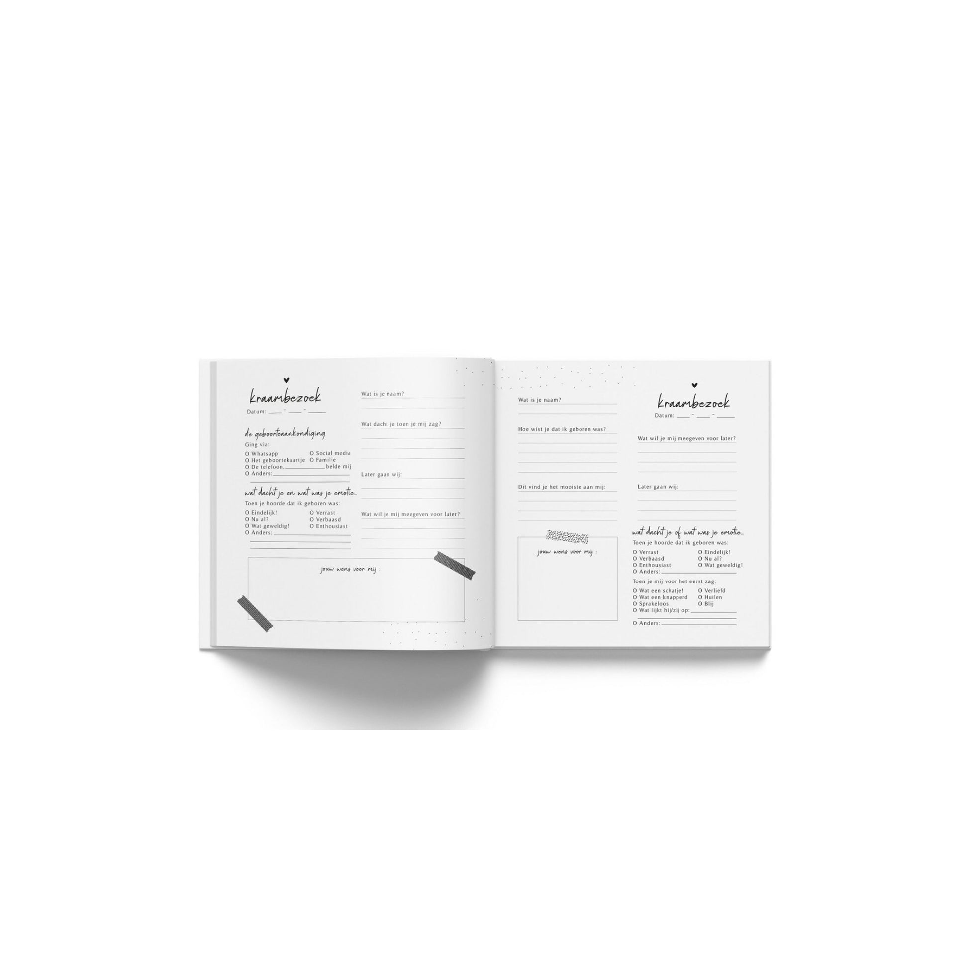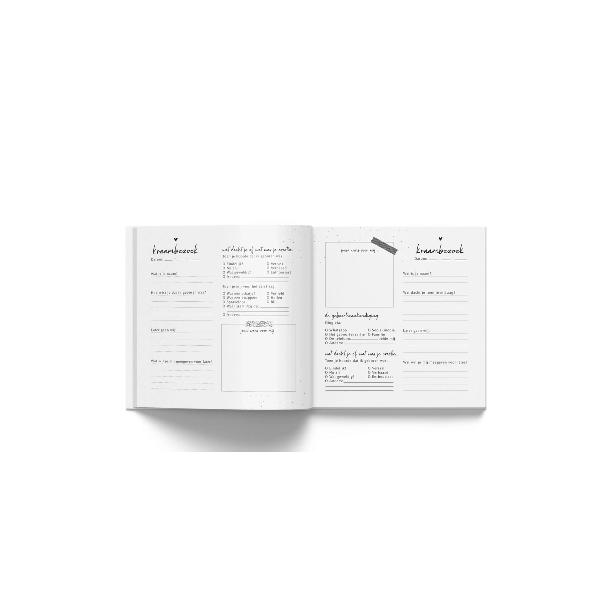 Het invulboek in zwart/witte stijl bevat 45 pagina’s over het kraambezoekvan de baby. Leg de mooiste herinneringen vast en schrijf alle mooie momenten tijdens de kraamperiode met jouw baby op in dit mooie invulboek.