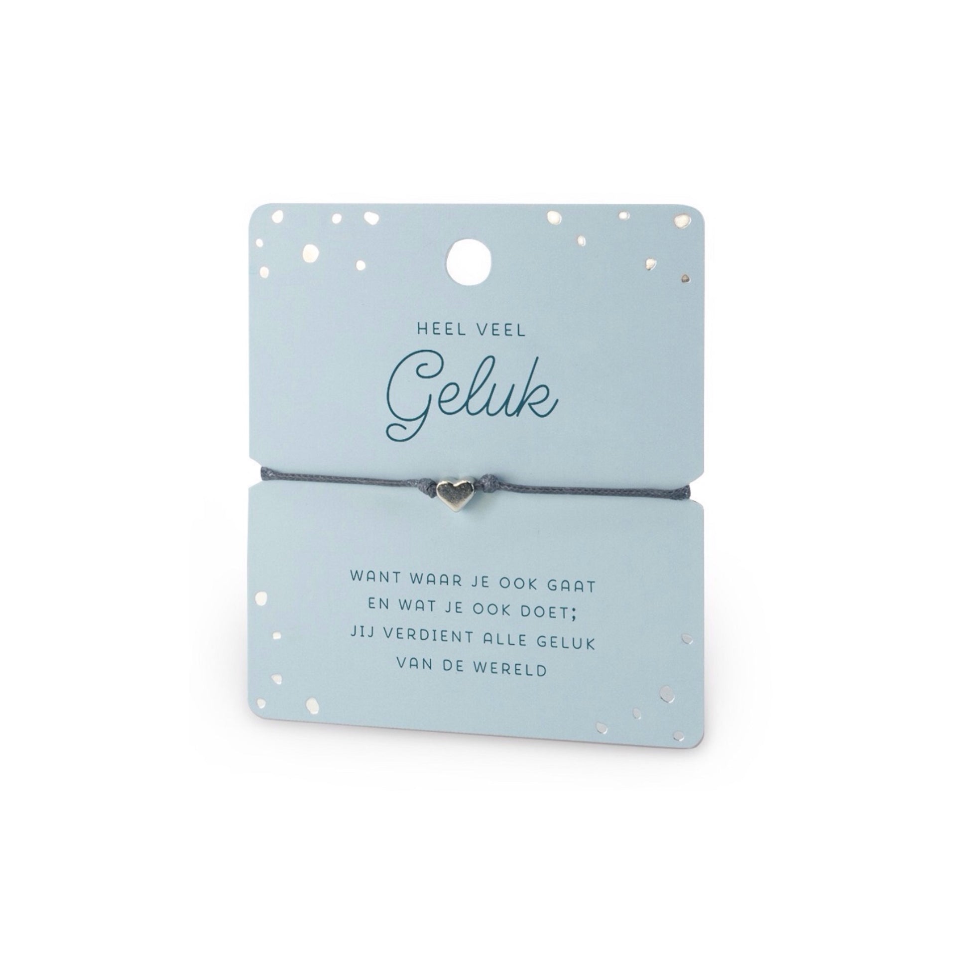 Zoek je een klein, speciaal cadeautje om een dierbare geluk te wensen? Dan is dit geluksarmbandje een perfecte keuze! Dit geluksarmbandje met een klein, zilverkleurig hartje wordt geleverd op een mooi cadeaukaartje met de tekst: heel veel geluk, want waar je ook gaat en wat je ook doet; jij verdient al het geluk van de wereld. Met deze boodschap op het kaartje wordt jouw cadeautje nog specialer. Of dit armbandje nu een cadeautje is voor een collega die weggaat, een vriendin die je een hart onder de riem wil steken of een andere dierbare die wat geluk kan gebruiken, voor elke gelegenheid is dit geluksarmbandje een goede keuze!