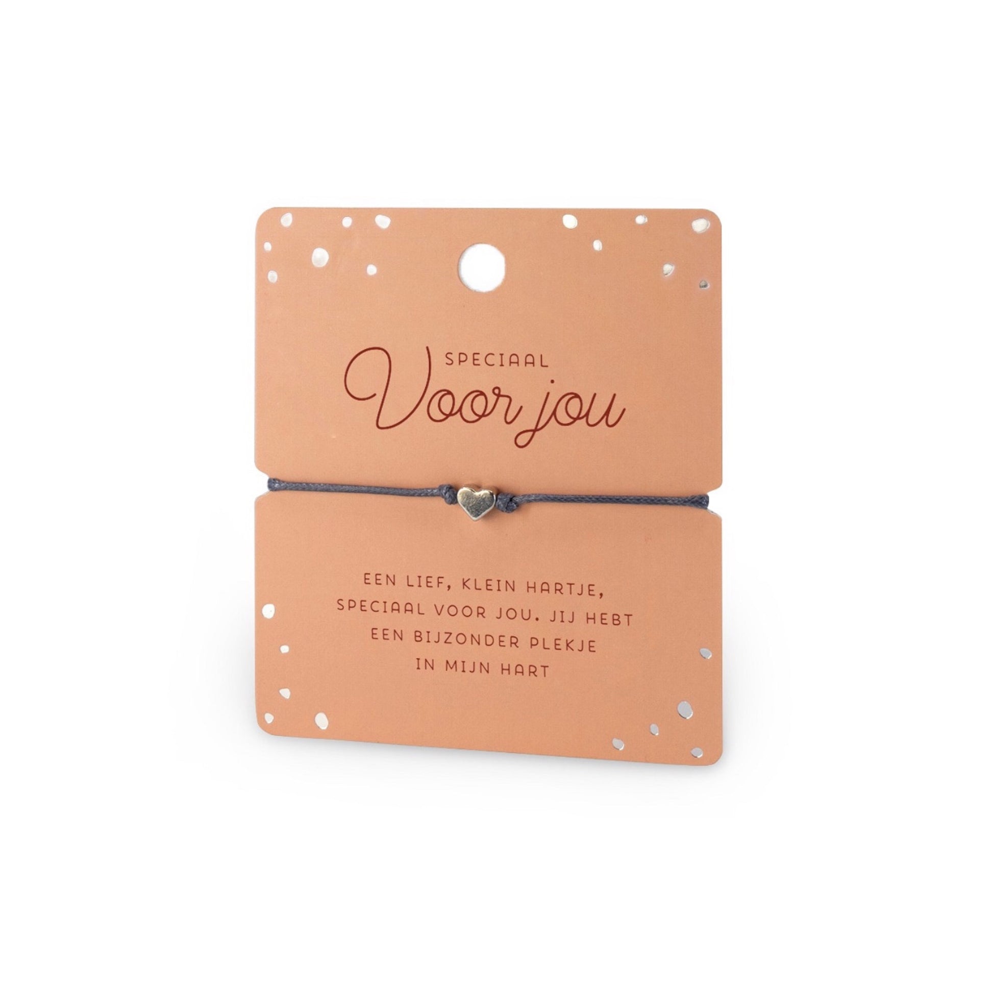 Zoek je een klein, speciaal cadeautje om een dierbare te verrassen? Dan zijn geluksarmbandjes een perfecte keuze! Dit lieve geluksarmbandje met een klein goudkleurig hartje wordt geleverd op een mooi cadeaukaartje met een lieve tekst. Op het cadeaukaartje staat: Speciaal voor jou, een lief, klein hartje speciaal voor jou, jij hebt een bijzonder plekje in mijn hart. Met deze geluksarmbandjes kun je een dierbare laten weten hoe blij je met haar bent! Geef een cadeau wat voor een blijvende herinnering zorgt, en laat de ontvanger voelen hoe bijzonder zij is. Geluksarmbandjes zijn de perfecte keuze om iemand een lach op haar gezicht te toveren!