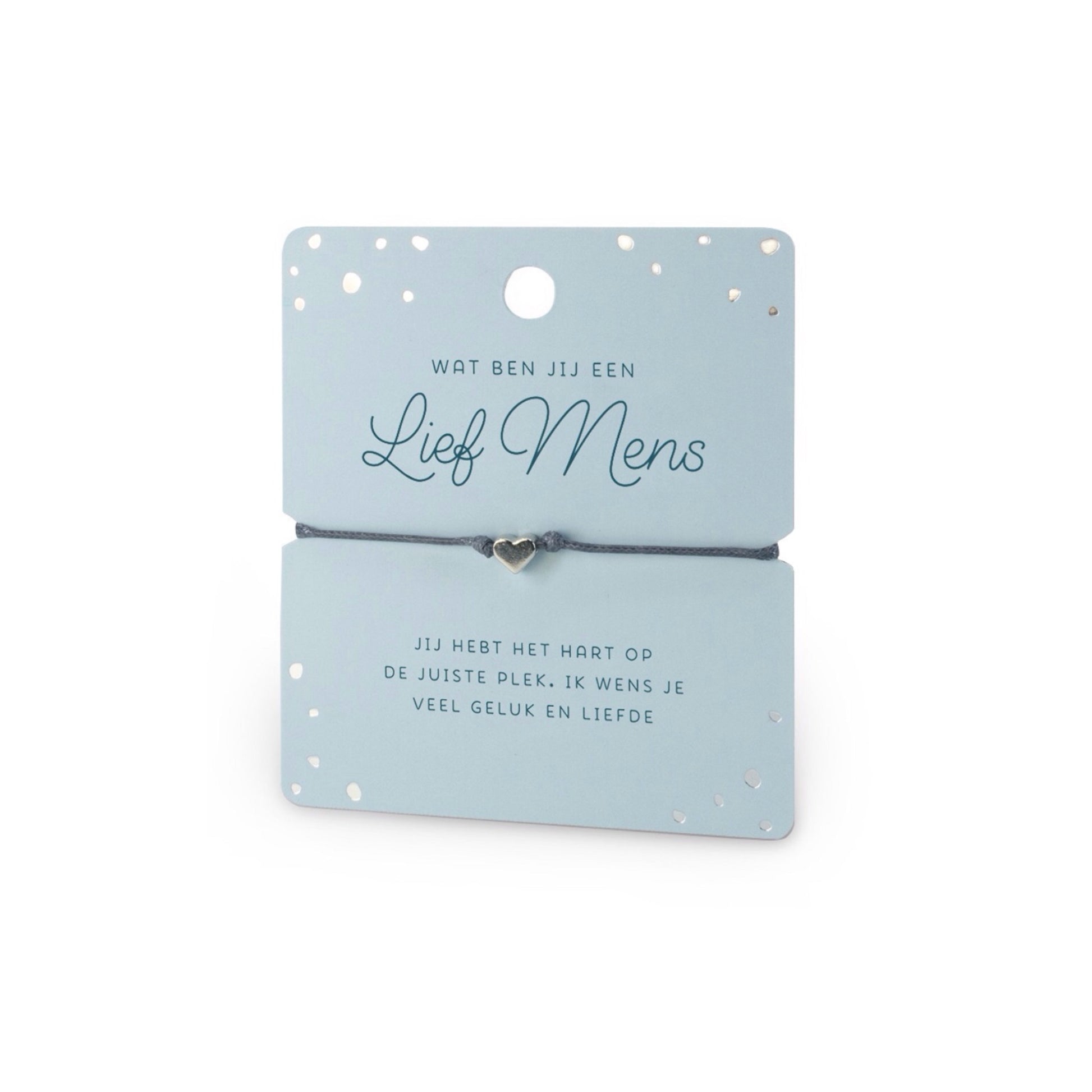 Zoek je een speciaal, klein cadeautje om een dierbare mee te verrassen? Dan is dit geluksarmbandje ‘wat ben jij een lief mens’ een perfecte keuze! Het zilverkleurige armbandje met schuifknoop, wordt geleverd op een mooi cadeaukaartje met een lieve tekst. Wie wil jij laten weten hoe blij je met haar bent? Geef dit geluksarmbandje cadeau en tover een lach op het gezicht van de ontvanger. Op het cadeaukaartje staat ‘wat ben jij een lief mens, jij hebt het hart op de juiste plek. Ik wens je veel geluk en liefde’. Met deze lieve boodschap wordt het cadeautje nog specialer en laat je aan de ontvanger weten dat ze gewaardeerd wordt.