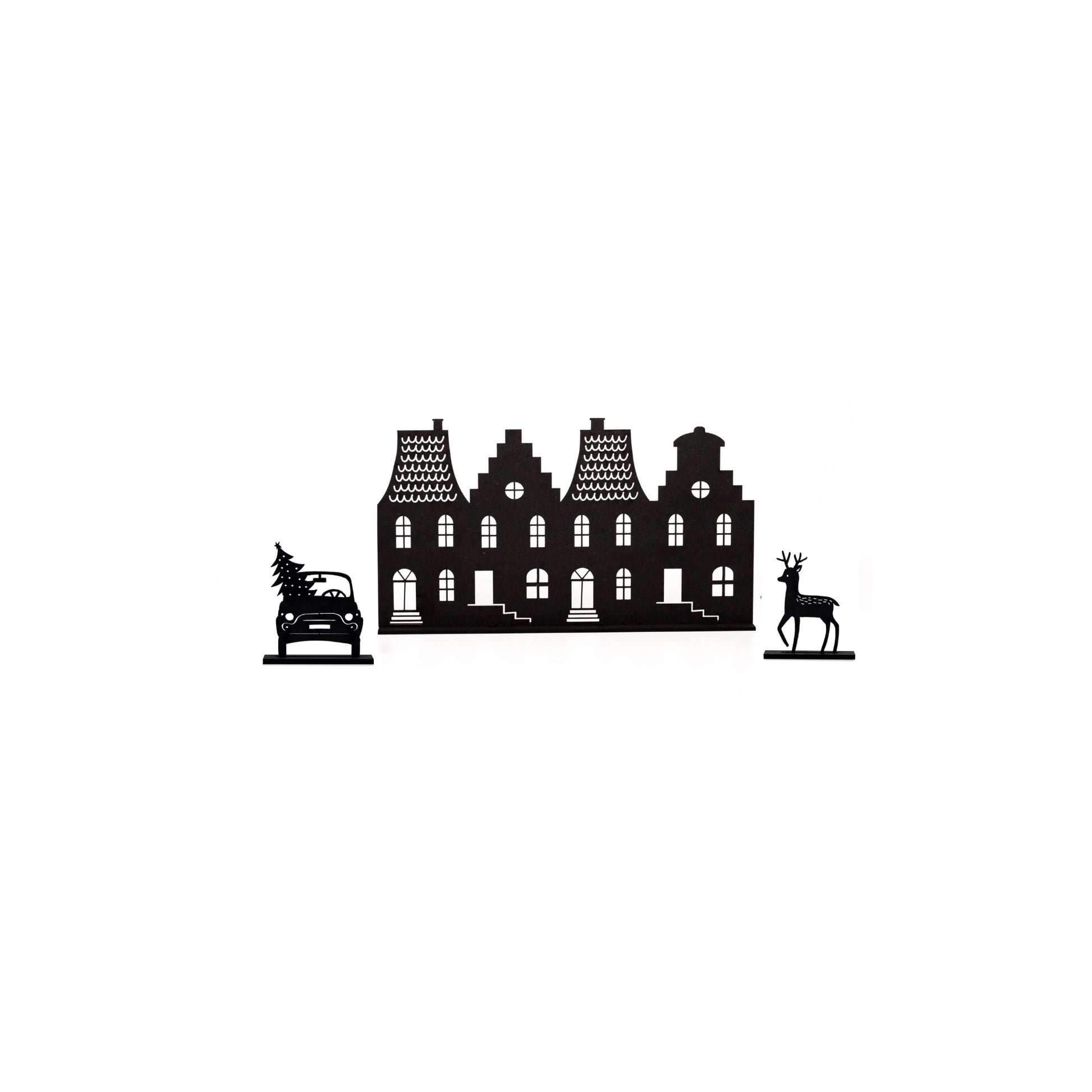 Deze schattige Kerst decoratie bestaat uit een grachtenpandje, auto en rendier.